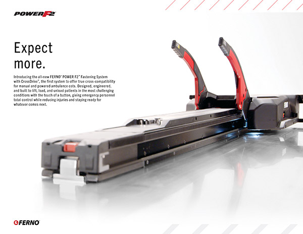 Introducing the all-new FERNO® POWER F2™ Fastening System with CrossDrive™. Designed, engineered, and built to lift, load, and unload patients in the most challenging conditions with the touch of a button, giving emergency personnel total control while reducing injuries and staying ready for whatever comes next.